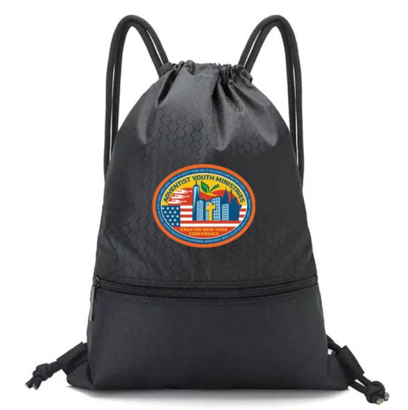 Good quality drawstring backpack with the Greater New York Conference Adventist Youth Ministries logo in Black.